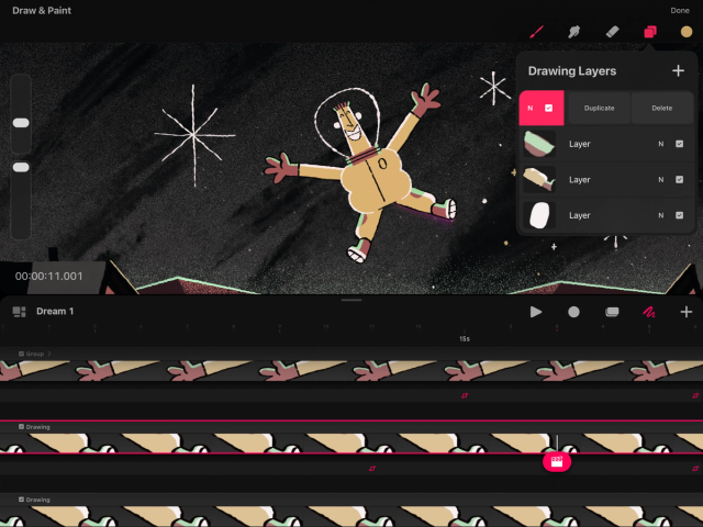 Any changes you make on the Stage will affect your currently selected layer. Procreate Dreams identifies your current selected layer by highlighting it. Tap a layer to select it. To select multiple layers, swipe right on each one. Delete and Group options will then appear.
