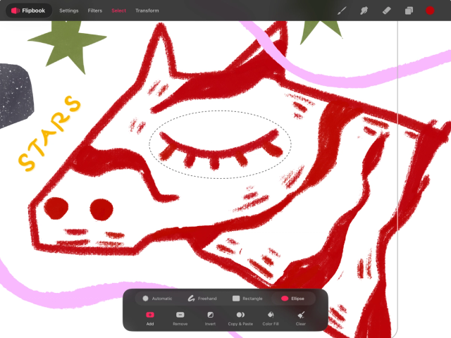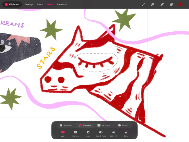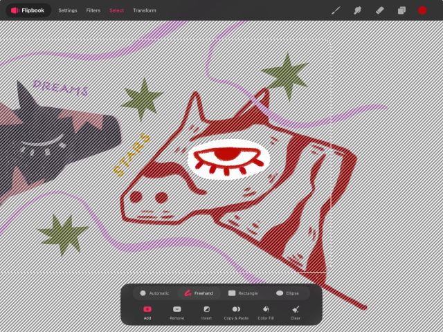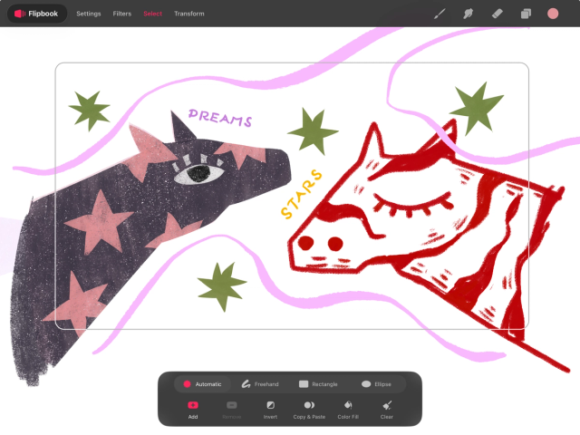 There are multiple methods of selection in Procreate Dreams, and your selection will be applied to your current layer or set of layers. To access the tool, enter a Drawing or Flipbook and then tap Select at the top of the interface. Tap Select again at any time to exit the tool: