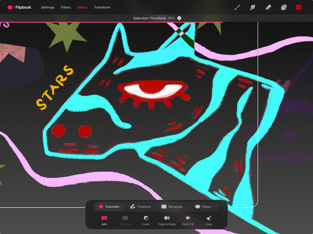 Tap on an area of color with your finger or Apple Pencil to select that whole body of color. Similar areas of color that border the target will be selected based on your Selection Threshold. You can adjust this by holding down as you make your initial selection, and dragging left to reduce the Threshold, and right to increase it.