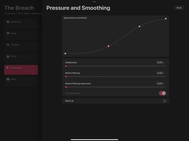 Use Procreate’s customizable App Pressure Sensitivity curve to adjust the feel of your Pencil or stylus. This will help you get the most out of your Apple Pencil. Adjust your Apple Pencils pressure in the Preferences section of Movie Settings. Find out more about how App Pressure Sensitivity works in the Procreate Handbook.