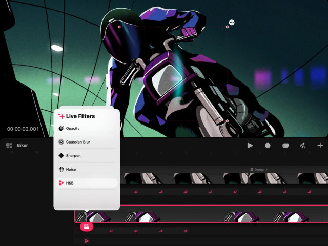 Live filters apply visual effects and color adjustments on objects using keyframes to animate them. These can make content fade away from view, blur as it changes depth of field, or shift colors as lighting changes.