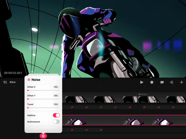 Create a film grain look to your animation or add organic texture like clouds and water to your work. Noise alters the amount of speckle and grain that appears on your content.