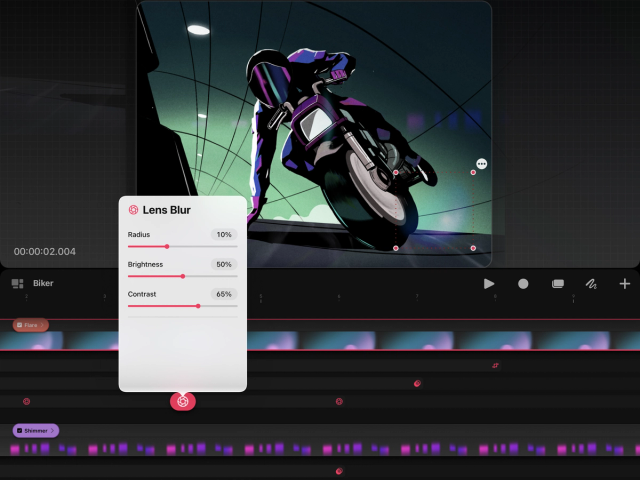 Although lens blur is essentially a 3D effect, Procreate Dreams replicates this effect in 2D by applying it to layers that act as a foreground or background. Unlike Gaussian blur which affects an entire image evenly, lens blur affects the highlights in an image more making brighter areas bloom. You can adjust the highlights and lowlights of an image using the Brightness and Contrast sliders. Set a Lens Blur keyframe, then:
