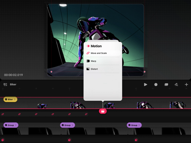 Tap Move to add motion, warp, or distort keyframes. Tap Filter to add opacity, gaussian blur, sharpen, noise, or HSB keyframes.