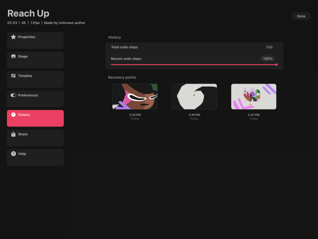 Manage how Procreate Dreams’ undo history behaves and access Recovery points to reload previous versions of your movie.