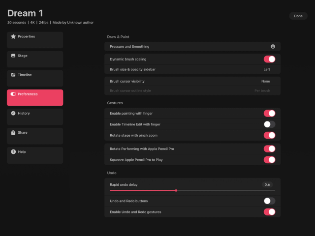 Customize Procreate Dreams’ basic behavior to your liking with preference settings.