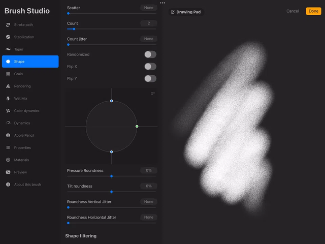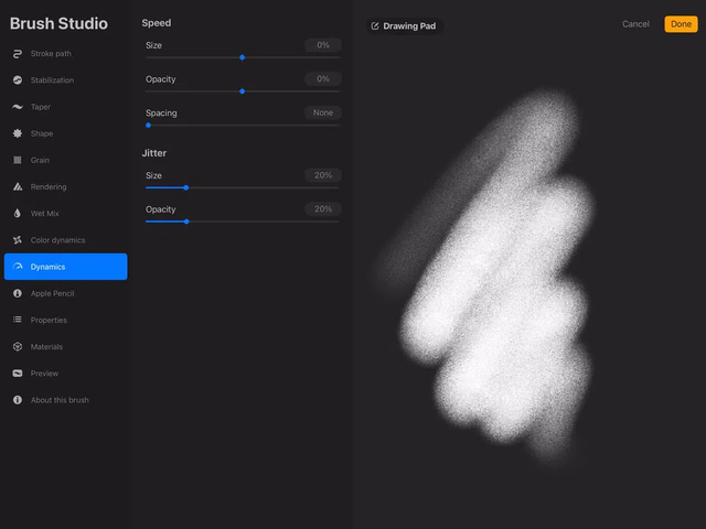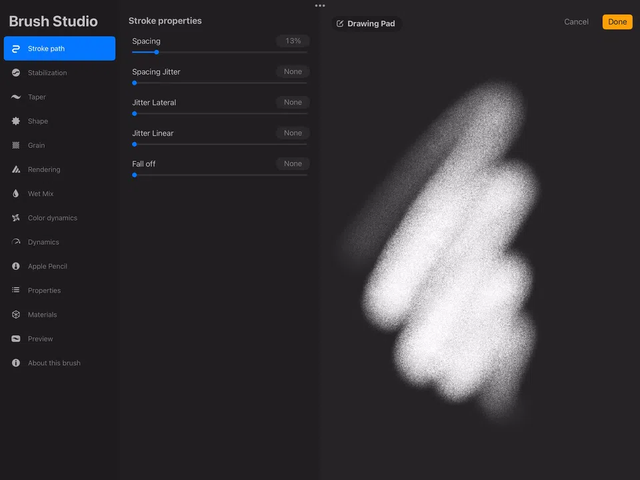 - Stroke Path → Spacing Jitter, Jitter Lateral, Jitter Linear. Add and control the placement of your brush stamps along the path of the brushstroke.