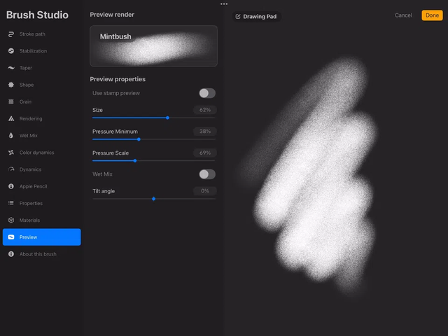- Preview (new tab). Customise how your brush appears in the Brushes interface with options such as Size, Pressure Scale, Wet Mix, etc.