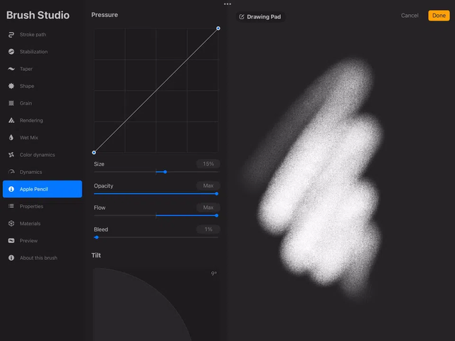 - Apple Pencil → Pressure Graph. Adjust the overall pressure settings for each individual brush.
