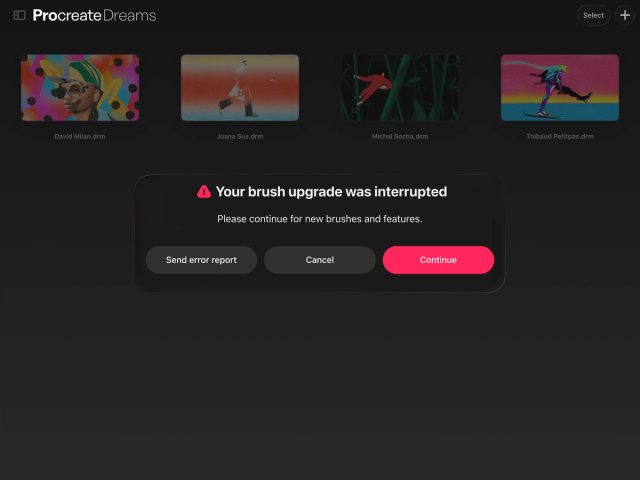 Please keep Procreate Dreams open and foregrounded during the Brushes system upgrade. If you minimise or close Procreate Dreams, this will prevent the upgrade from completing successfully.