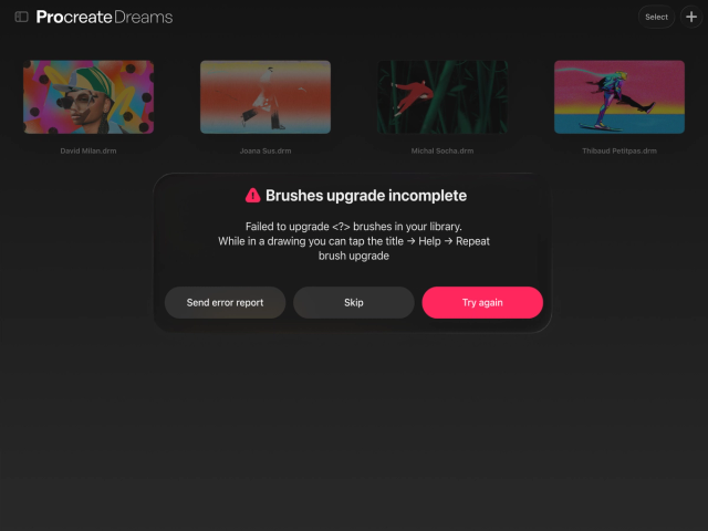 You can also Skip the brushes that failed to upgrade, and continue using the app, or send us an error report with the 'Send error report' button.