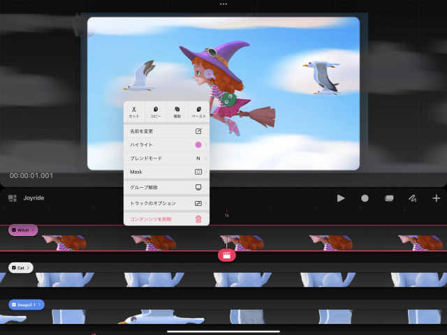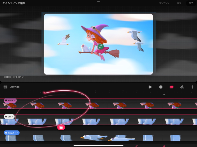 移動やアニメーションの作成、エフェクトやフィルタを、グループに対して適用することでワークフローをスピードアップできます。キャラクターの身体や衣類など、関連するコンテンツのグループにも便利な機能です。
