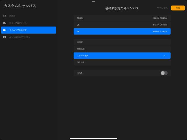 タイムラプスの設定値が高いほど、Procreate ファイルのサイズが大きくなります。4K とロスレスを組み合わせた最大値では、非常に大きな Procreate ファイルが作成されます。