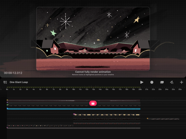 デバイスのトラックのレンダリング上限を超えると、Procreate Dreams はタイムラインの一番上でトラックのレンダリングを停止します。これらのトラックはタイムライン上に表示され、引き続き編集できますが、ステージ上には表示されず、.drm ファイル以外の形式でムービーを書き出す場合には含まれません。.drm ファイルには、レンダリング上限を超えるものを含めすべてのトラックが書き出されます。