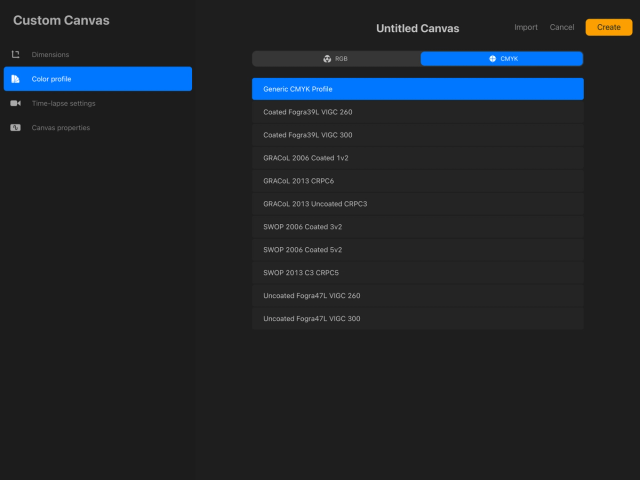 デフォルトでは、「スクリーンサイズ」オプションを使用して作成された新しいアートワークは RGB またはディスプレイ P3 であり、代替の RGB カラー プロファイルにのみ切り替えることができます。 CMYK で新しいアートワークを開始したい場合は、メニューでカスタムキャンバス を選択します。