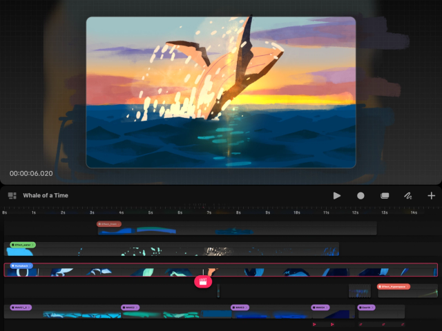 ムービーを開くと、スクリーンの下半分に“タイムライン”が表示されます。タイムラインを操作すると、コンテンツやキーフレームなどを追加、編集できます。