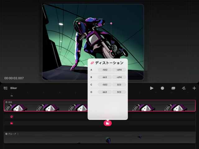 『ディストーション」 キーフレームを設定してから、バウンディングボックスのコーナーノードタップしてドラッグし、オブジェクトのディストーションを調整します。