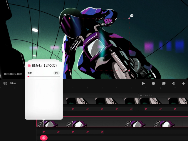 “ぼかし(ガウス)”キーフレームを設定し、思いどおりのぼかし具合が得られるまでスライダを動かします。