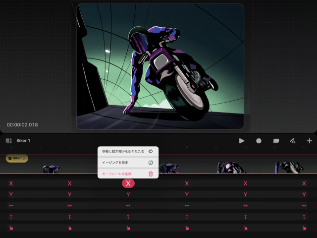 キーフレームを削除するには、対象のキーフレームをタップして押さえたままにし、表示されるコンテキストメニューの“キーフレームを削除” をタップします。