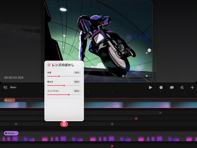 「レンズのぼかし」キーフレームを設定したら、以下の操作を行ってみましょう。