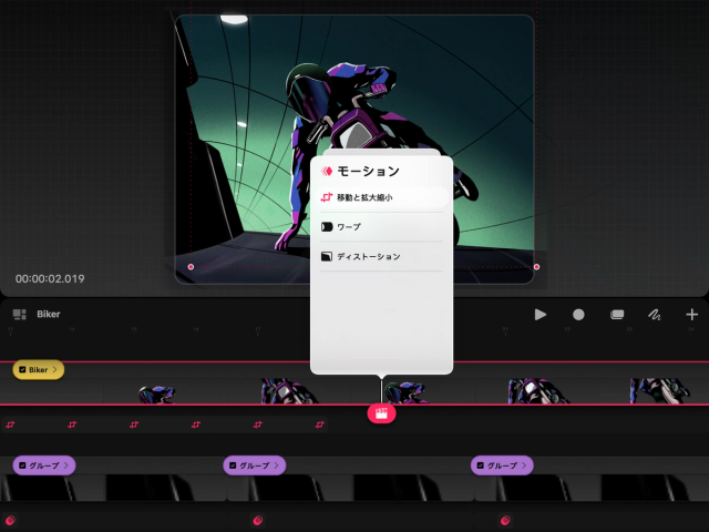 “移動”を使うと、移動と拡大縮小やワープ、ディストーションのキーフレームを追加できます。また、“フィルタ”を使うと、不透明度、ぼかし(ガウス)、シャープ、ノイズ、HSB といったキーフレームを追加できます。