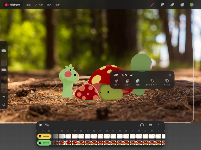「コピー & ペースト」メニューでは、コンテンツの一部をクリップボードにコピーし、クリップボードから画像を「描画」や Flipbook に取り込むことができます。