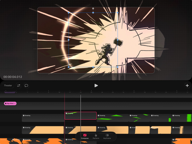 When in Compose mode, move, rotate, stretch, and flip visual content on the Stage. Use Perform mode to record changes to your content, and use Keyframe mode to input and edit keyframes for it.