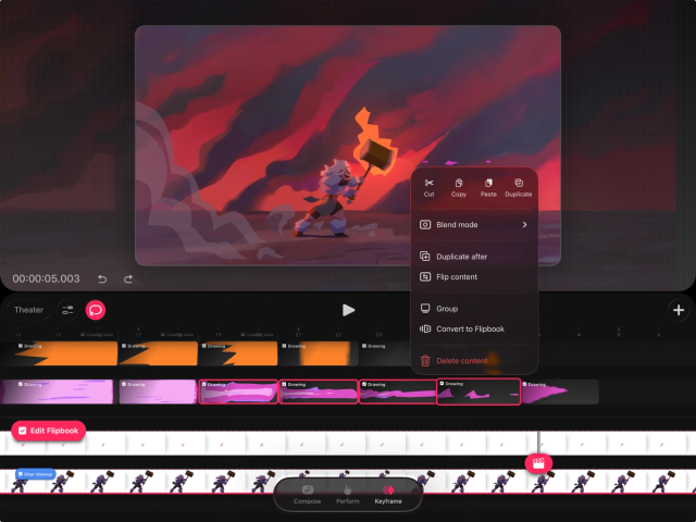 Using the steps above to select content with Multi-select, you can combine any content (sans audio) into a Flipbook. Use Multi-select, draw around content, then tap and hold on any selected element to bring up the content options menu. Tap Convert to Flipbook in here, and wait for Procreate Dreams to perform the conversion.