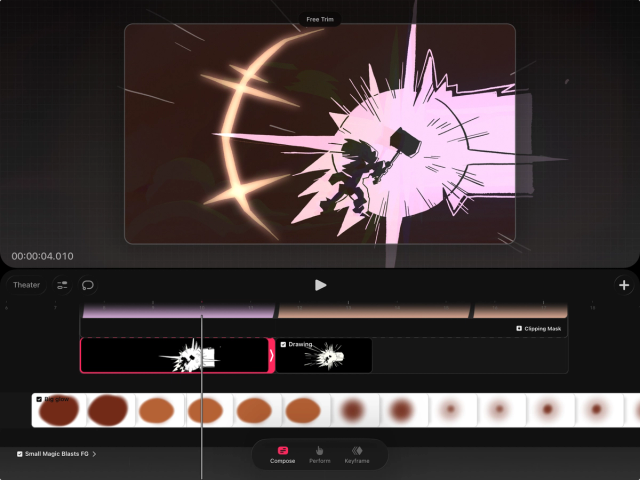 Trimming in Procreate Dreams is non-destructive. This means you can go back and extend the content if you change your mind later, and trimming content won't decrease the file size of your movie.