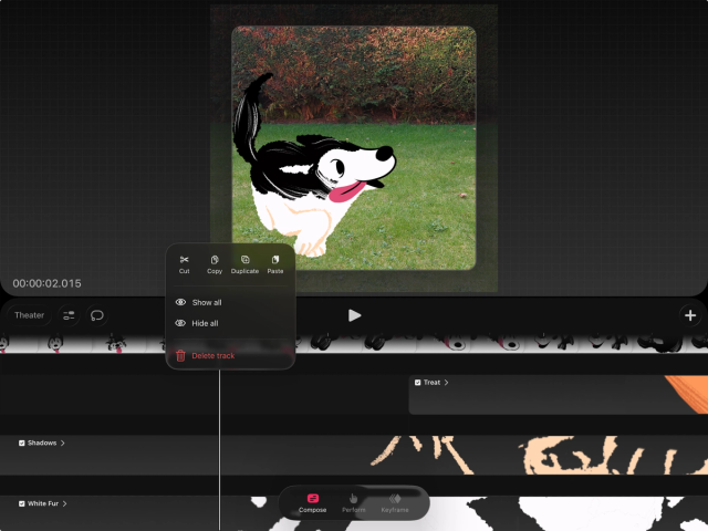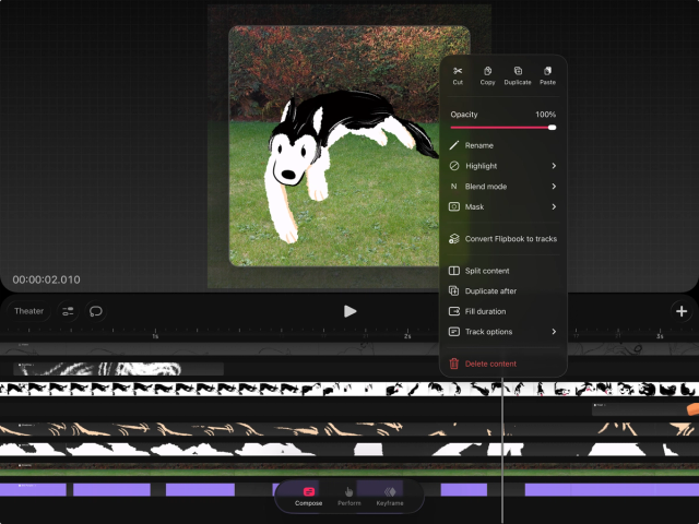 All content you create and import into Procreate Dreams appears on a track. Tap and hold a track to access the track options menu, and tap and hold on a piece of content to access the content options menu.