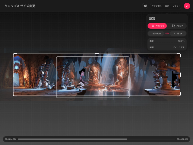 「クロップ & サイズ変更」インターフェイスを開き、「設定」→「再サンプル」をタップすると、再サンプルのオプションが表示されます。再サンプルを有効にすると、補間処理でコンテンツの縦横比をロックして拡大縮小できます。