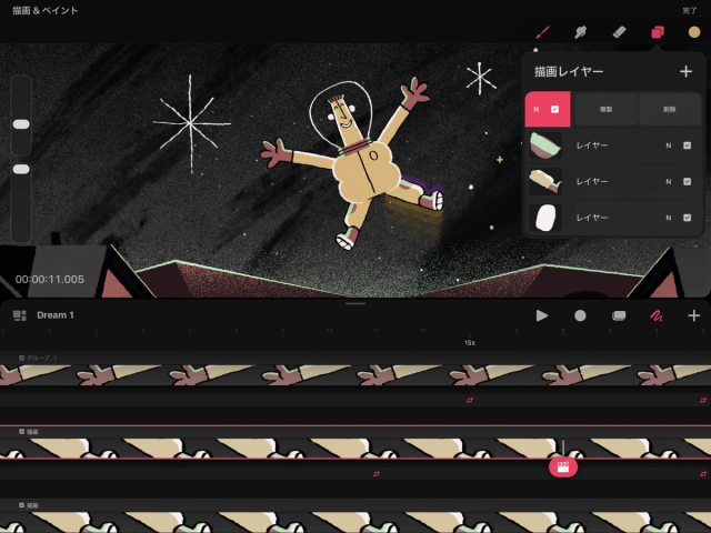 描画レイヤーは、イメージのエレメントを重ね合わせて 1 つのコンテンツを作成する機能です。作成済みの個所を変更することなく、オブジェクトを重ねて描くことができます。エレメントを編集したり削除したりして、創造力を存分に発揮しましょう。