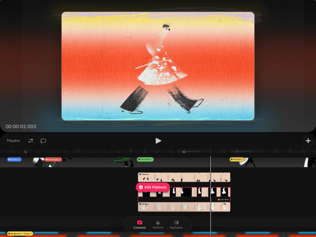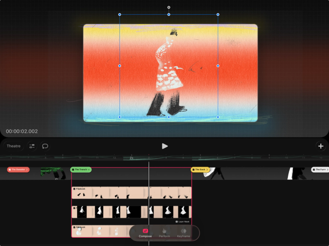 When you open a movie, the Timeline sits in the bottom half of your screen. Add and edit content in the Timeline, and make use of the three main Modes: Compose, Perform, and Keyframe.