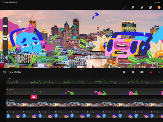 Procreate Dreams の“ステージ”は、タッチ操作に特化して設計されています。ワークフローのスピードアップに役立つ“ステージ”のジェスチャについては、このハンドブックの「 ジェスチャ 」ページを参照してください。