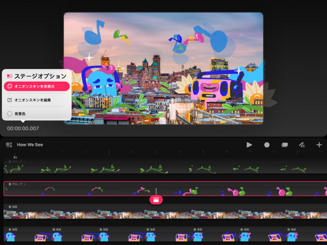 タイムラインモードでも描画 & ペイントモードでも、ステージオプションにアクセスするには、タイムコードをタップします。これらのオプションを使うと、オニオンスキンの表示、非表示、編集や、ステージ全体の反転、背景色の変更などができます。