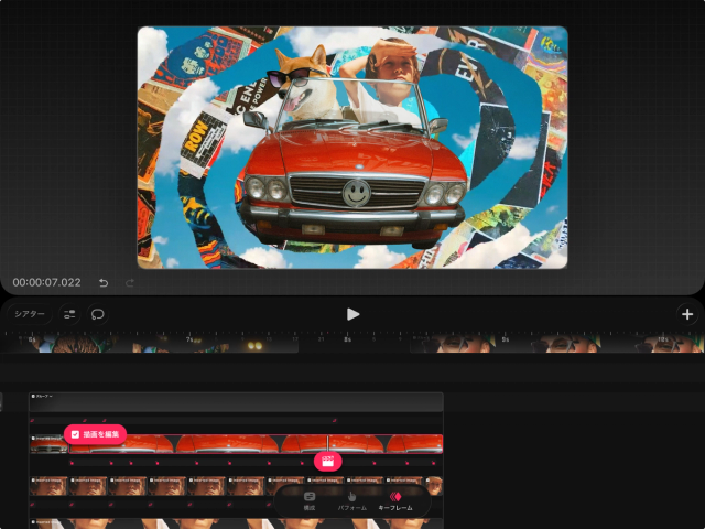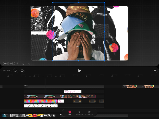 「キーフレーム」モードでは、コンテンツのキーフレームやイージングの作成や調整ができます。インターフェイスの下部にある「キーフレーム」をタップすると、「キーフレーム」モードに入ります。