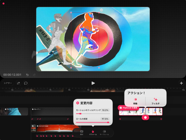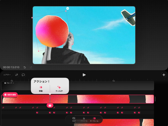 「再生ヘッド」をコンテンツ上に置き、それをタップすると「フィルタ」のキーフレームオプションが表示されます。これにより、イメージ、アニメーション、ビデオのコンテンツにイメージフィルタを適用できます。