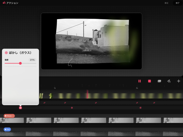 パフォームでは、ジェスチャを使ってモーションやライブフィルタなどのアクションをリアルタイムで記録できます。実行したアクションはすべてキーフレームとして記録され、コンテンツの下のキーフレームトラック上に表示されます。