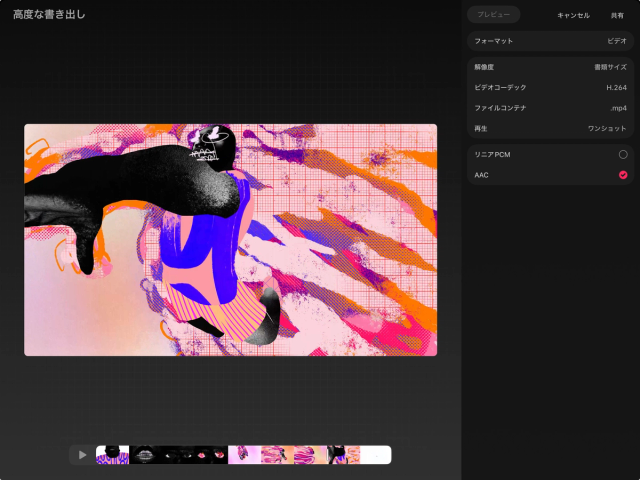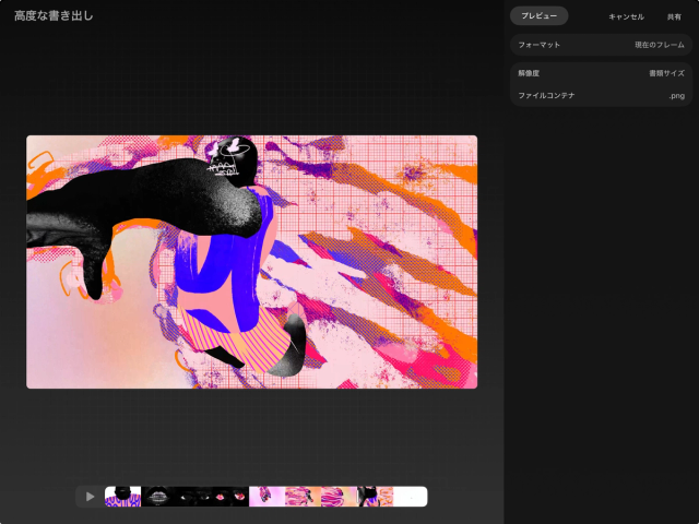 複雑で長いプロジェクトの場合、高性能なデバイスでもプレビューとレンダリングに時間がかかることがあります。「プレビュー」のレンダリング中や、「共有」でムービーを書き出している間は Procreate Dreams を閉じずにそのままお待ちください。