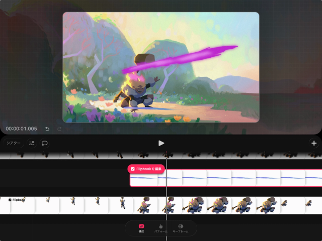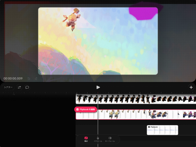 トラックには、ムービー制作に使用したコンテンツが含まれます。画像、ビデオ、オーディオなどの読み込んだファイルのほか、Procreate Dreams で作成したFlipbook、描画、テキストなどもトラックに配置されます。