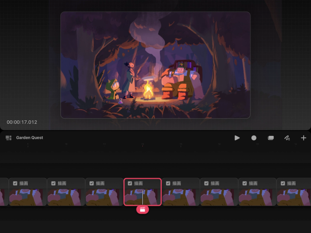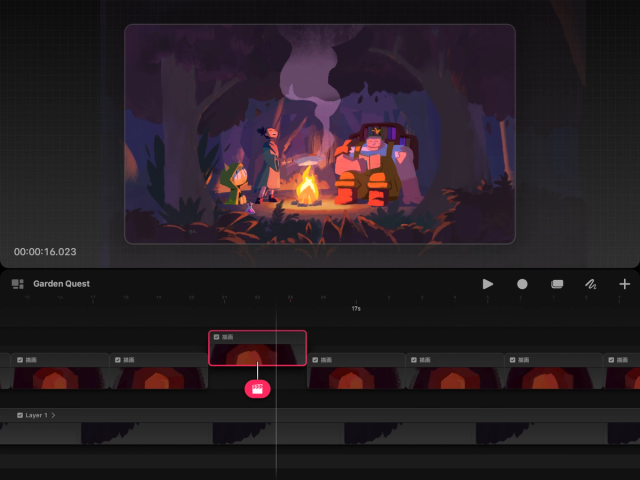 トラックにはムービーを作成するためのコンテンツが含まれます。イメージやビデオ、オーディオなど、読み込んだコンテンツでも、テキストや描画など、Procreate Dreams で作成したコンテンツでもかまいません。