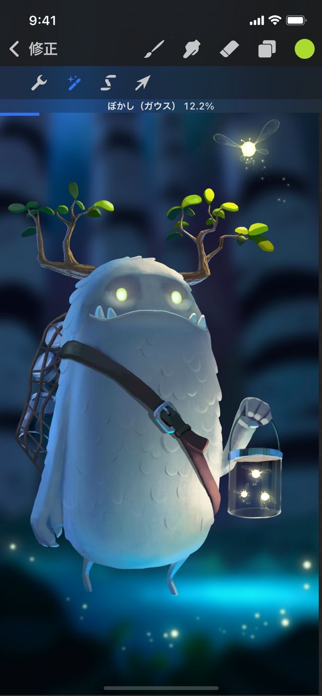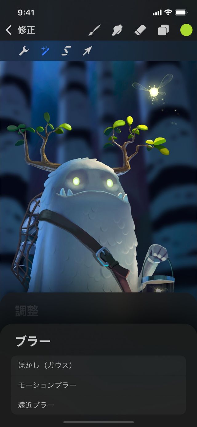 変更を確定して “ぼかし (ガウス)” を表示したままにするには、キャンバスをタップして “調整アクション” を呼び出し、“適用” をタップします。