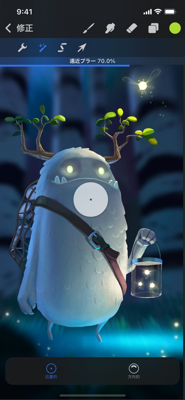 変更を確定して “遠近ブラー” を表示したままにするには、キャンバスをタップして “調整アクション” を呼び出し、“適用” をタップします。