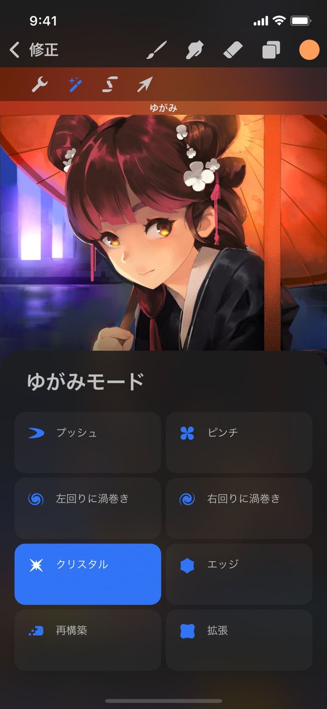 一番下のメニューの左端のボタンは、デフォルトで “プッシュ” に設定されています。ボタンをタップしてゆがみモードのリストを表示し、使用するモードをタップします。