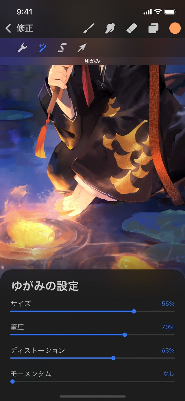 指でゆがみを操作すると、常に “筆圧” スライダで設定した最大の効果が適用されます。