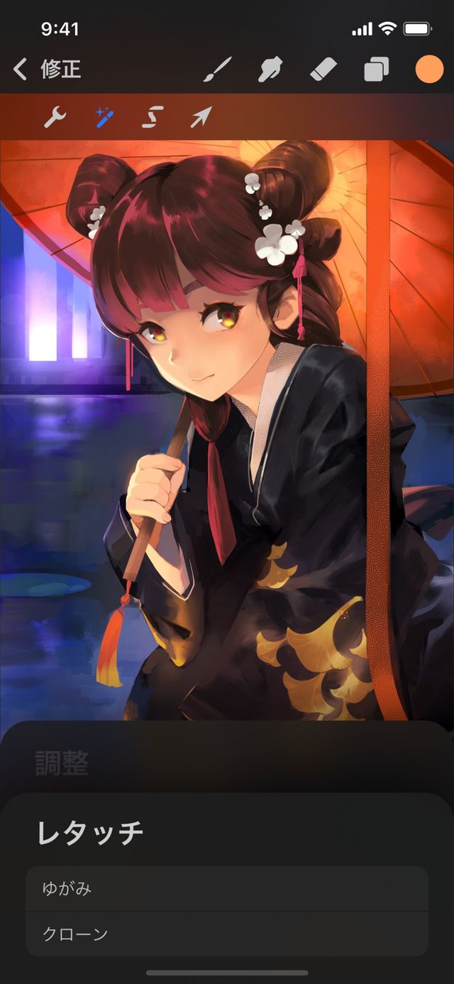 修正 > 調整 > レタッチ > ゆがみ をタップして、ゆがみのインターフェイスを呼び出します。