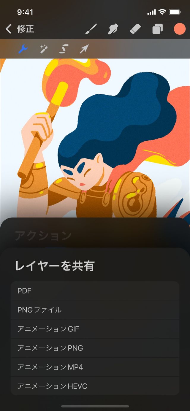 修正 > アクション > 共有 > レイヤーを共有 > アニメーションGIF をタップして、アニメーション GIF のインターフェイスを開きます。