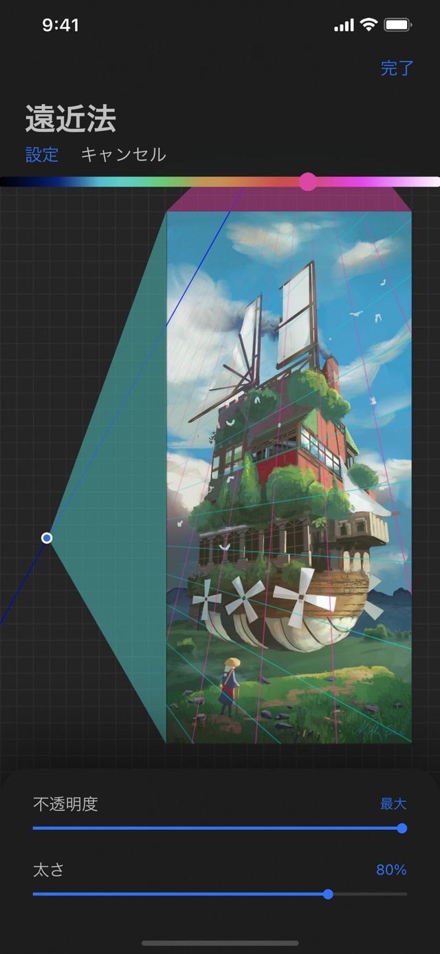 遠近法ガイドを設定するには、修正 > アクション > ガイド に移動して “遠近法” をタップします。 グリッドを編集するには “ガイド設定” をタップします。“描画ガイド” 画面が表示されます。
