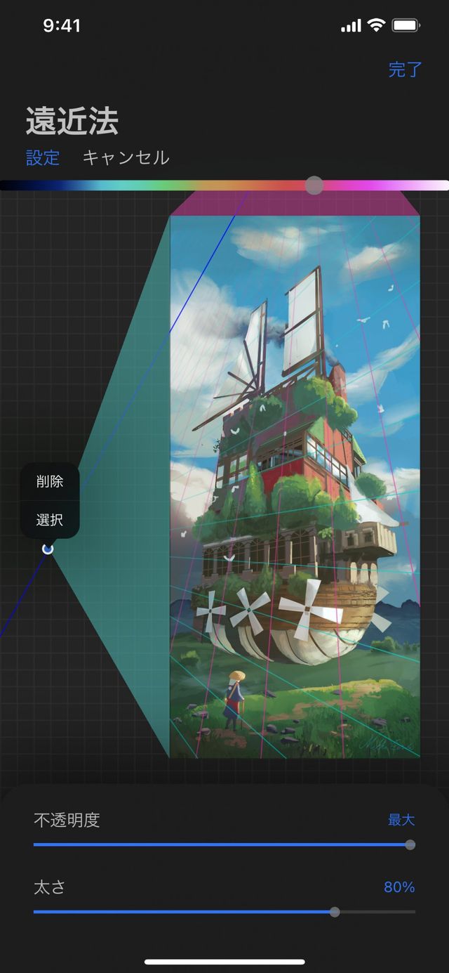 消失点を削除するには、消失点をタップし、“削除” をタップします。消失点をタップした後、“選択” をタップすると、その消失点のガイドのカラーを変更できます。