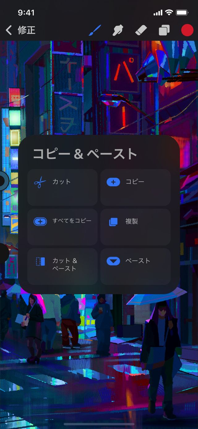 ドキュメントから選択部分を削除して iOS のクリップボードに保存する、基本的なクリップボード機能です。“カット” した内容は、同じキャンバスの別の場所、別の Procreate Pocket キャンバス、または別のアプリにペーストできます。